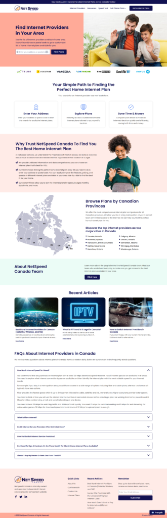 Overview NetSpeed Canada is an Internet Service Provider (ISP) comparison platform helping Canadians find the best home internet and cell phone plans by region. The client needed a completely custom-built WordPress platform with dynamic search features, provincial and city-based listings, and robust SEO to outperform competitors like WhistleOut and MovingWaldo. I developed the entire site […]